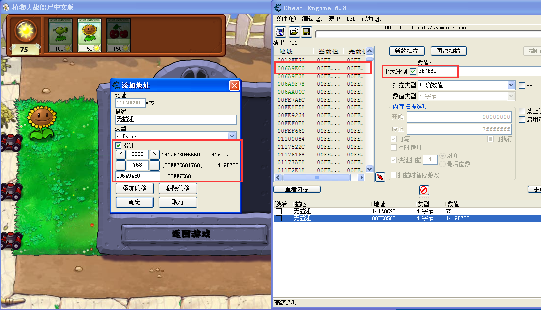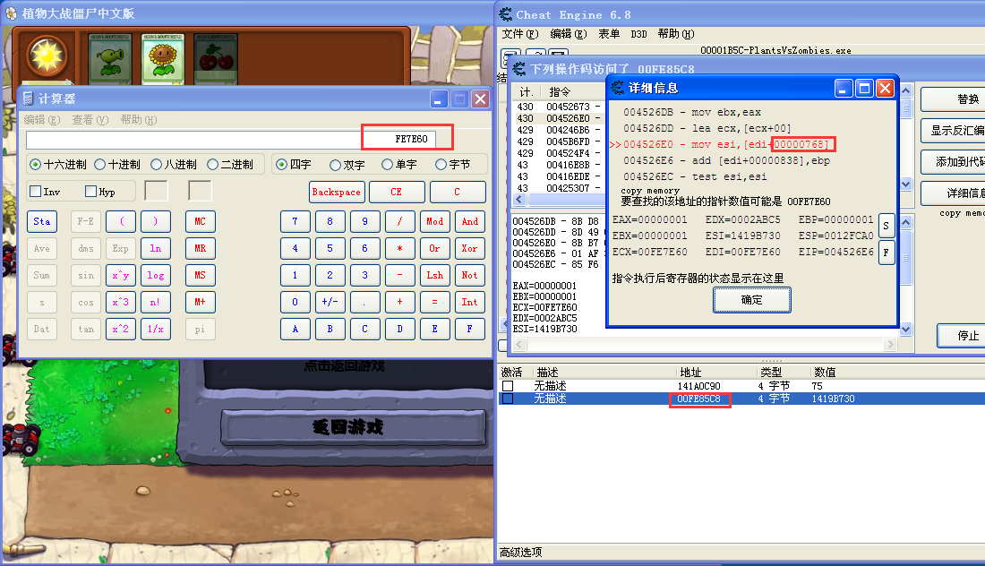3.继续查找这个动态地址FE7E60,此时我们可以看到基址006A9EC0,通过手工计算我们已经知道了其公式为006A9EC0 + 768 + 5560完成。