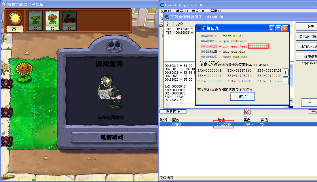 1.首先打开CE工具,并通过前期所学的内容快速的找到阳光的动态地址,然后我们在 141A0C90地址上选择查找访问地址,我们需要记下5560这个偏移地址。
