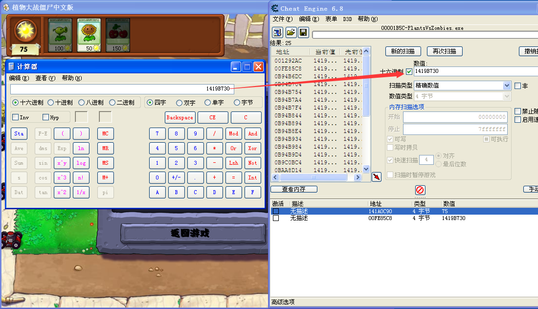 上图我们通过动态地址141A0C90 - 5560 即可得到上一个指针1419B730地址,直接在CE中继续搜索这个地址。
