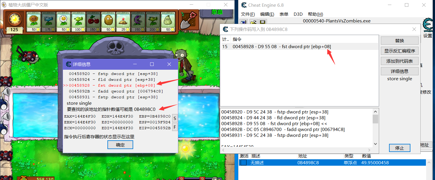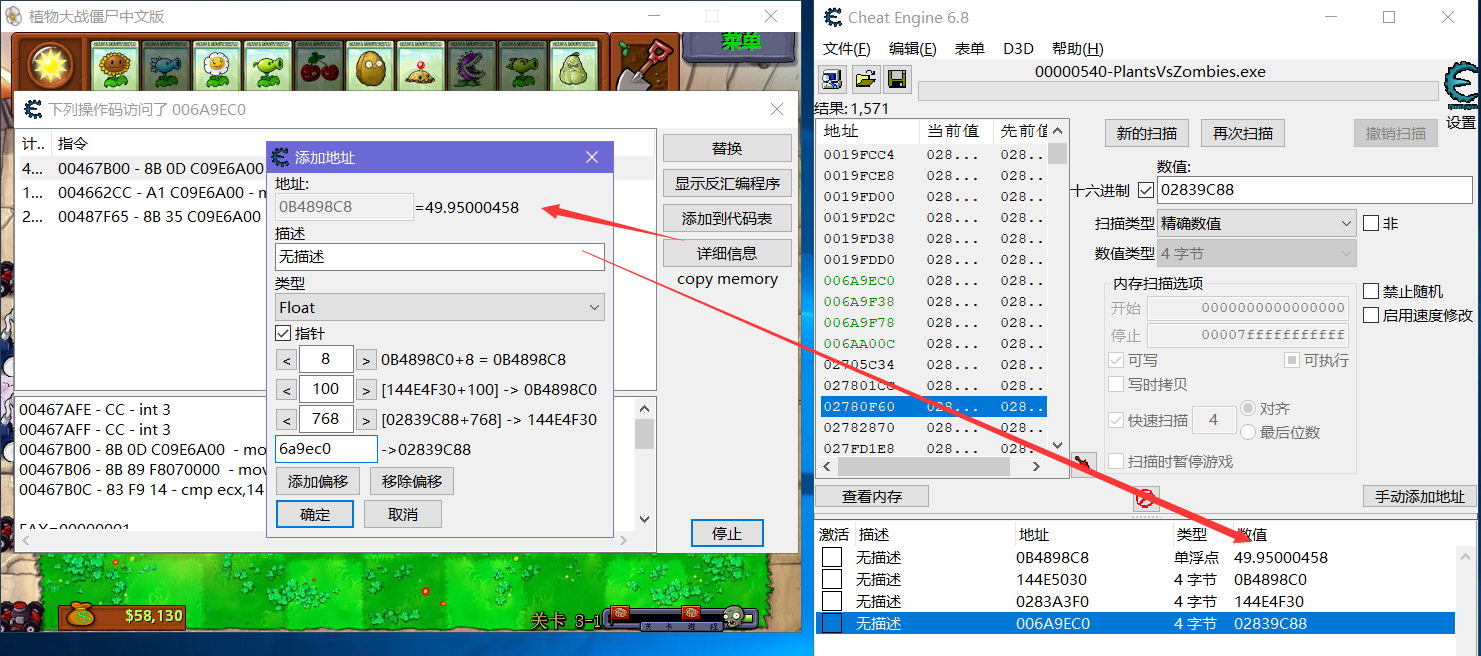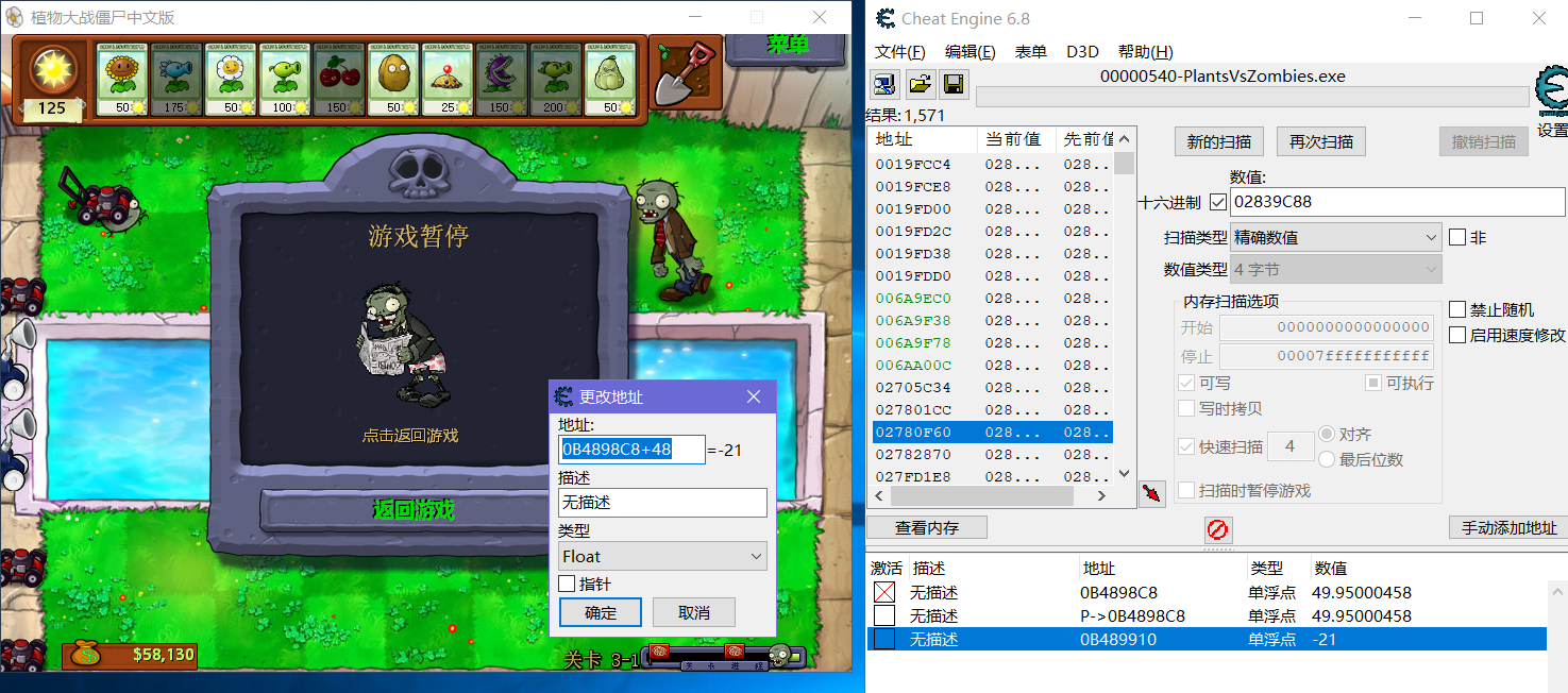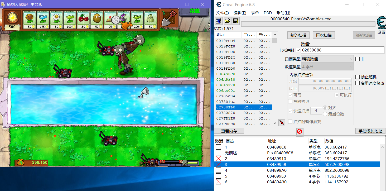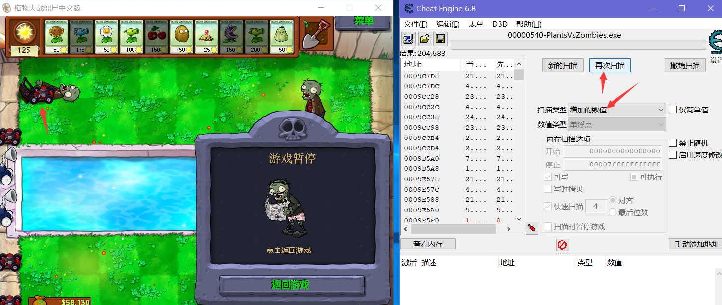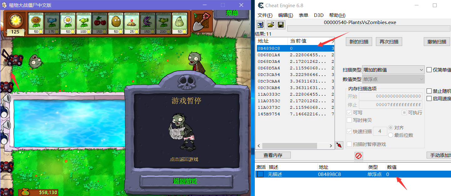2.等待僵尸踩到小车,迅速切回CE搜索,增加的数值。