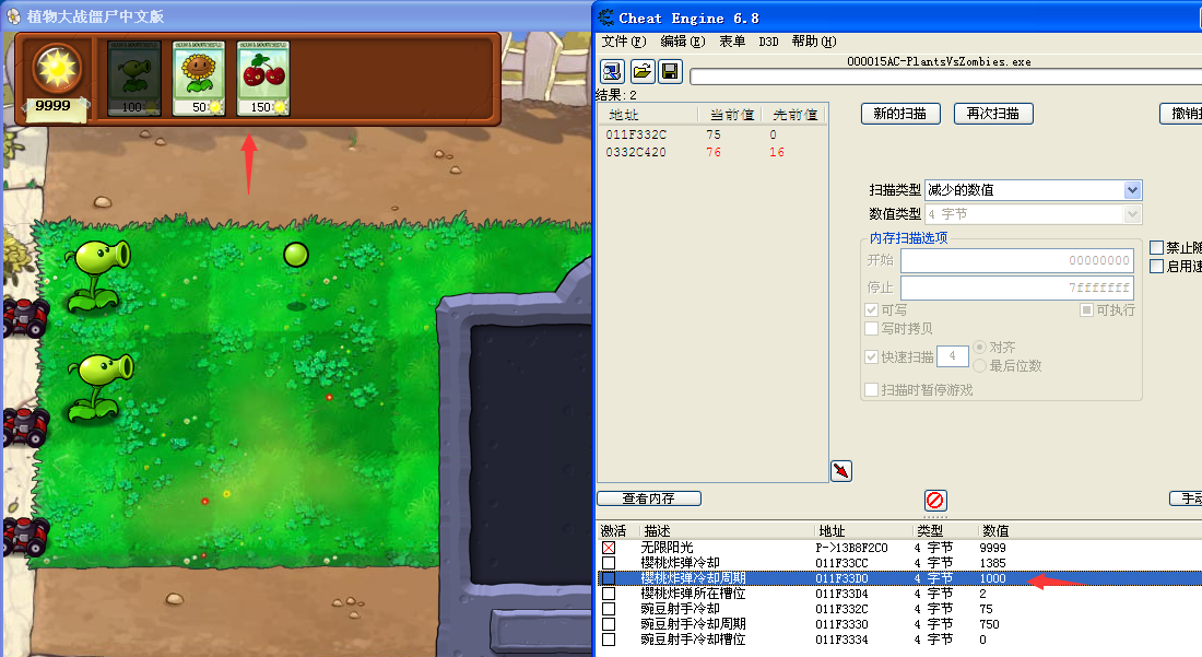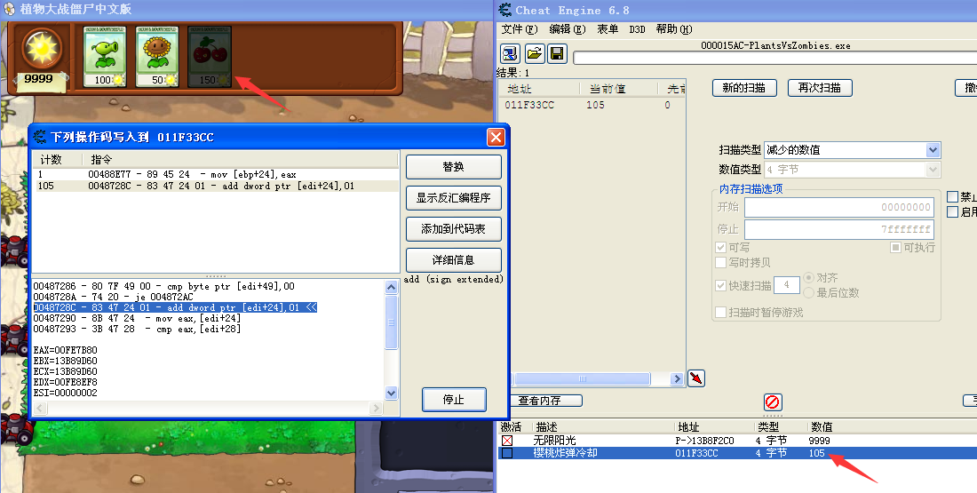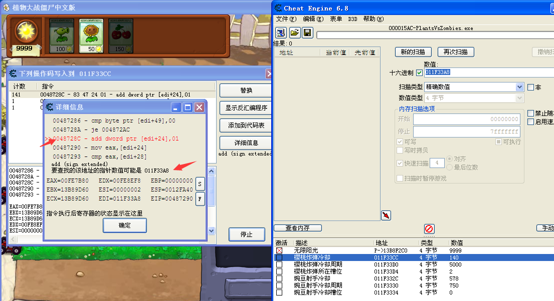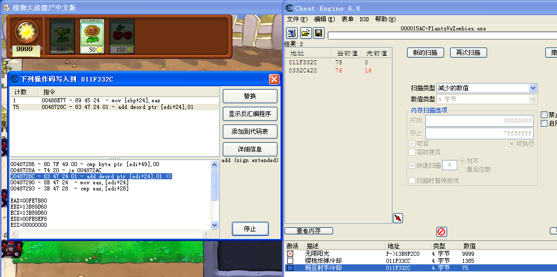 接着我们种下一个豌豆射手,然后用同样的遍历技巧找到豌豆射手的冷却周期,同样的查找写入,会发现其出现的地址与樱桃炸弹地址相同,说明游戏中所有的植物都是在共用add dword ptr [edi+24],01这条代码进行计时的。