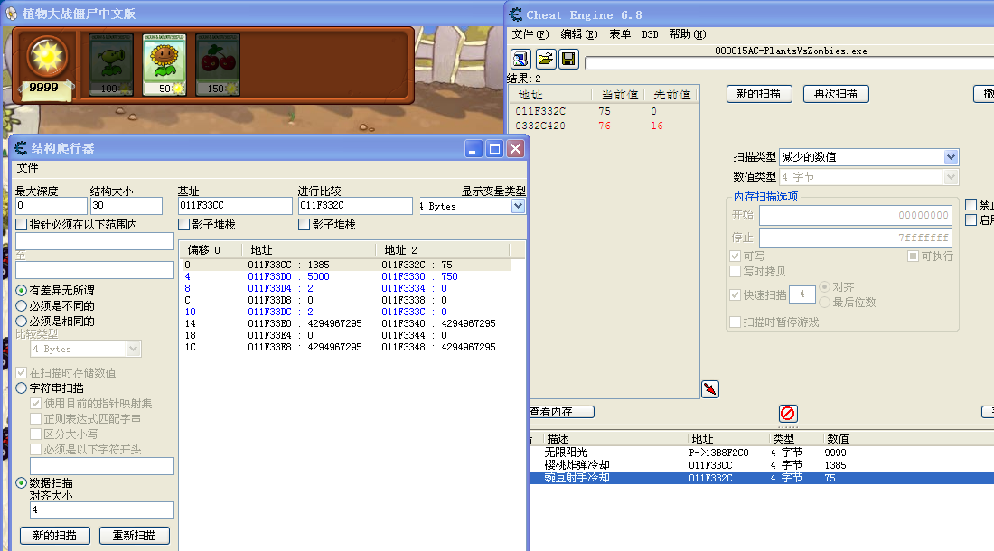 此时我们知道了樱桃炸弹的冷却时间地址是011F33CC我们还知道豌豆射手的地址是011F332C,接下来我们通过使用CE提供给我们的插件,结构爬行器来对比两个结构之间的差异,可知偏移为0的位置就是我们植物的当前冷却时间,而紧随其后的5000/750则分别代表的是植物的冷却周期,最后的2代表的樱桃炸弹卡片的位置,而0则代表豌豆射手的卡片位置。