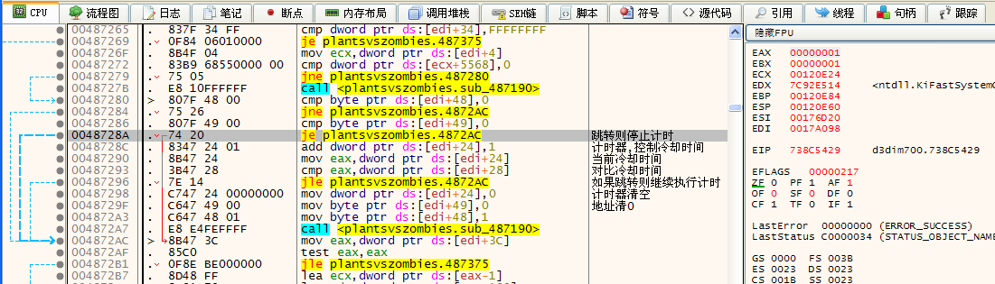 上图中已经做好了备注,此处改法有很多,你可以直接将add dword ptr ds:[edi+24],1里面的1修改为64这样一来植物的冷却速度就会变快,其次你也可以直接将jle plantsvszombies.4872AC处的指令直接nop掉,由于所有植物都会共用这一处区域进行冷却的验证,所以只要此处修改,所有的植物都会无冷却。
