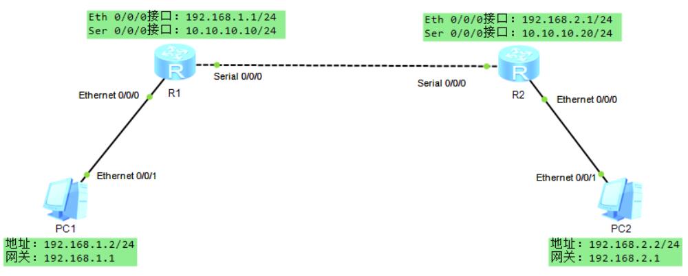 首先我们准备两台路由器(Router),需要注意的是设备之间的连接所选用的线路类型,一般情况下路由器和PC之间使用交叉线,两台路由器相连接使用串行线,配置成以下拓扑结构即可: