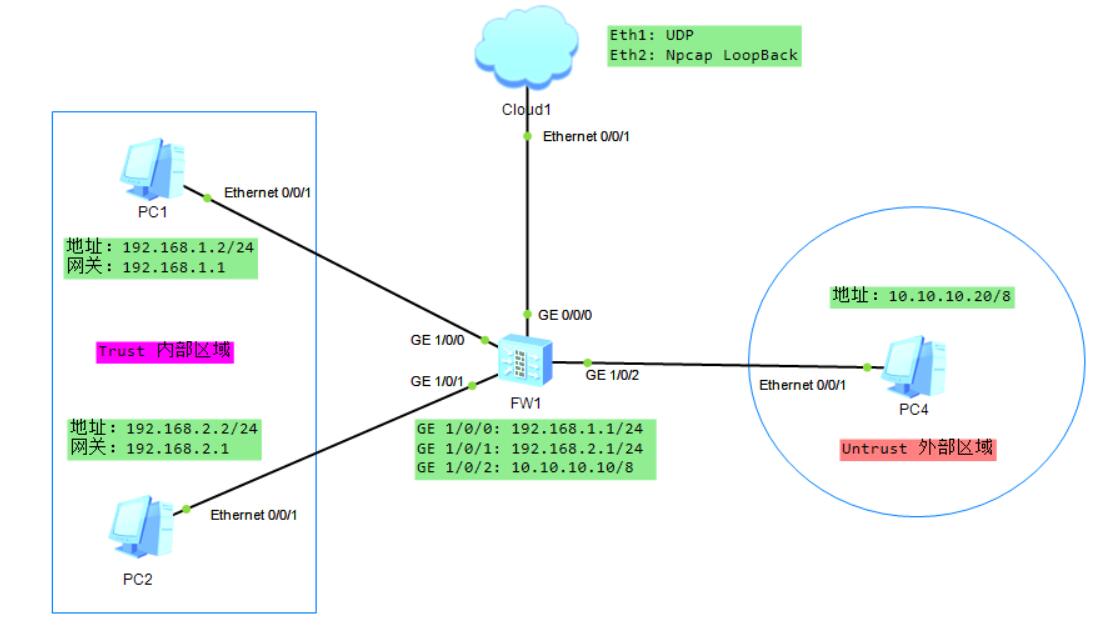 [FW1-zone-trust] add interface GigabitEthernet 0/0/0 // 把GE0/0/0加入到trust安全域