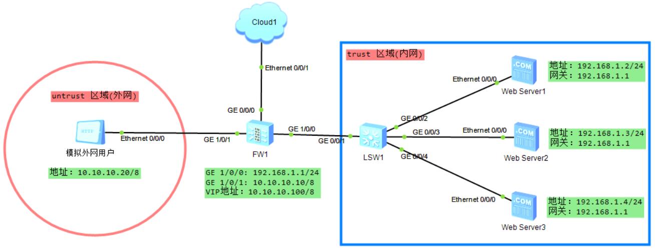 [FW1-slb-vserver-1] vip 1 10.10.10.100 // 设置虚拟服务器IP地址