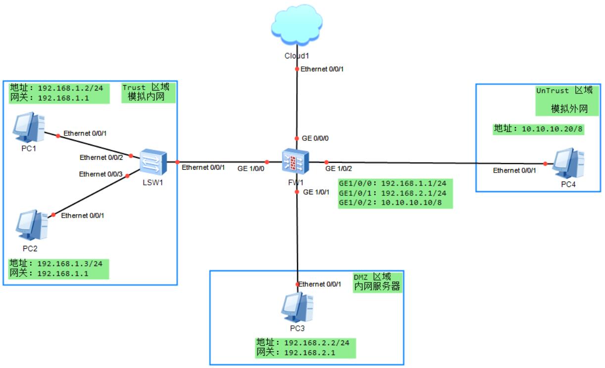 [FW1-GigabitEthernet1/0/2] ip address 10.10.10.10 255.255.255.0 // 配置IP地址