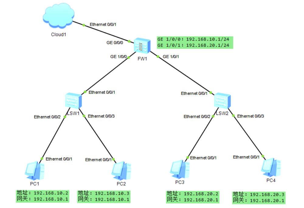 [FW1] interface GigabitEthernet 1/0/1 // 选择外部接口