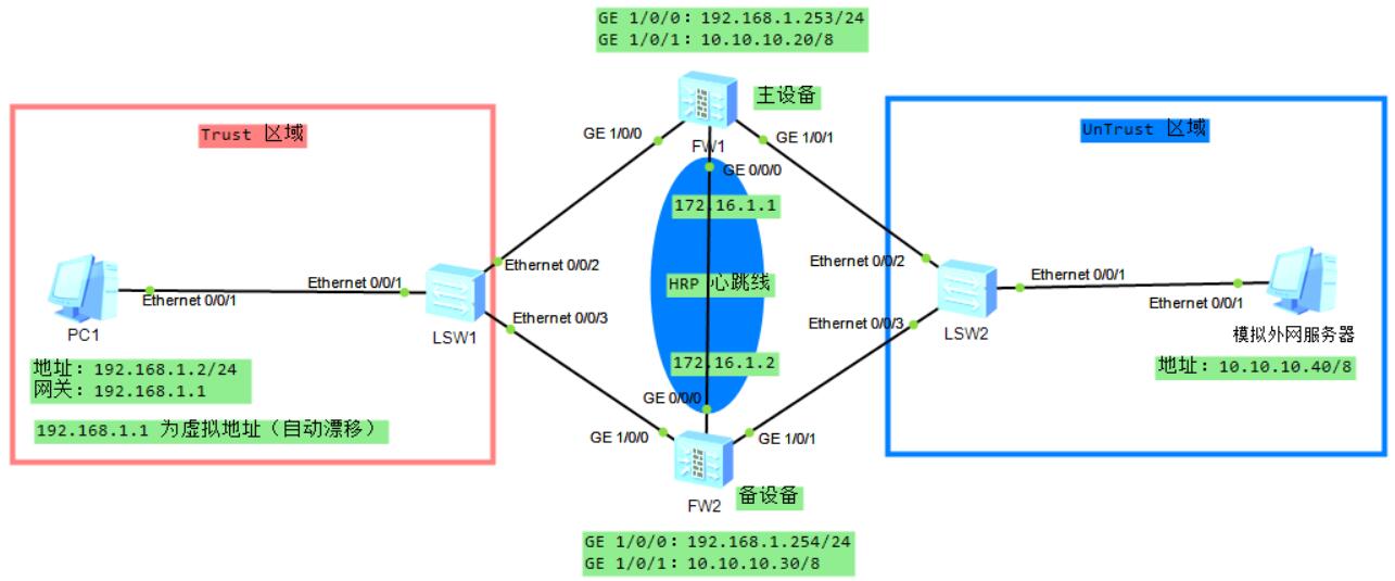 [FW2-GigabitEthernet1/0/0] vrrp vrid 1 virtual-ip 192.168.1.1 standby // 配置虚拟接口为备
