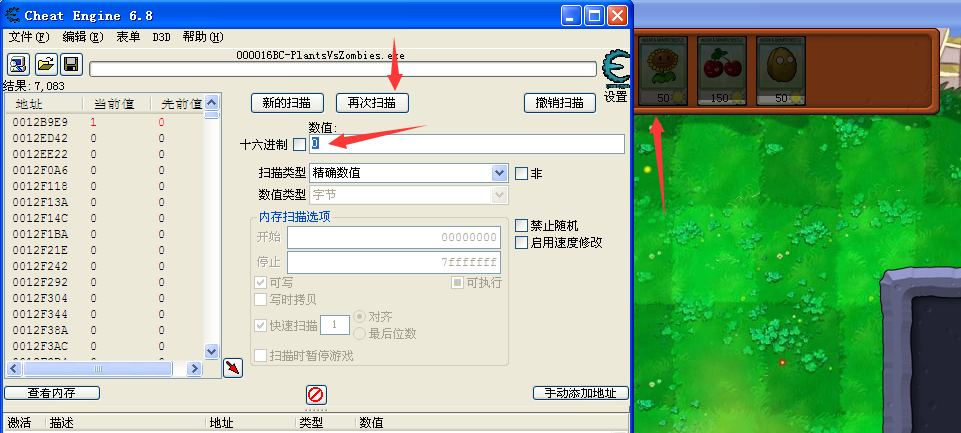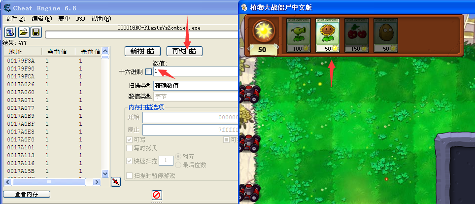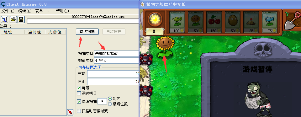 - 打开CE->回到游戏种植一颗向日葵 -> 扫描未知初始数值