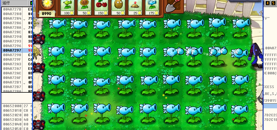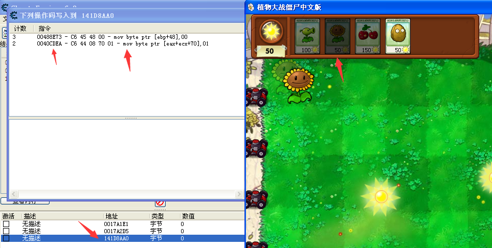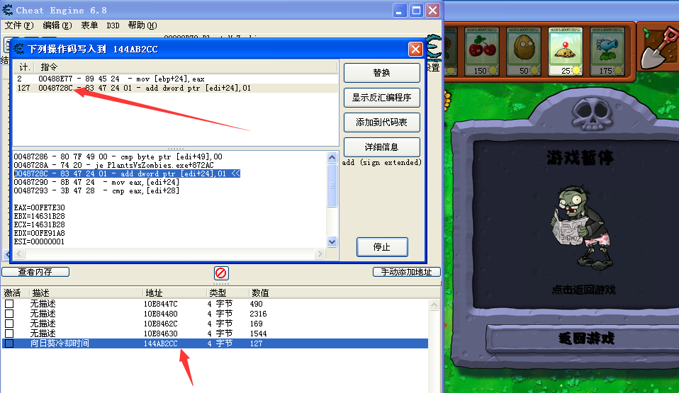 4.我们直接在找到的地址处右击,选择查找是什么写入了这个地址,或这直接选中并按下F6,回到游行并种植一颗向日葵,会发现有一行写入代码,我们记下它的内存地址0048728C,然后关闭CE吧。