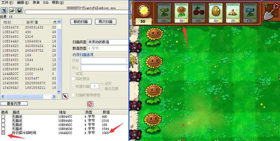 3.然后回到游戏,等待0.5秒左右,切回CE搜索未变动的数值,循环往复,如下我已经找到了,当我们将阳光地址锁定为1000的时候,向日葵则无需冷却了,说明这个定时器是一个递增的定时器。