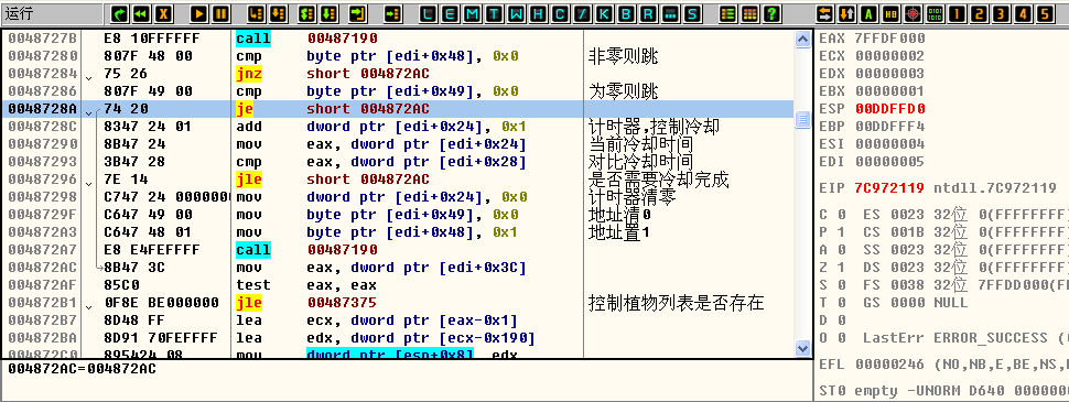 我已经将代码的大体功能分析的差不多了,这里我们有多种破解思路,第一种是直接将计时器的时间改大,这样植物的冷却时间会变快,或者直接将如下JLE直接NOP填充,由于所有的植物都会使用这一个计算冷却的CALL所以只要我们将跳转NOP掉的话,所有的植物自然就无冷却了。