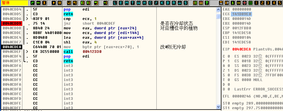 通过使用CE遍历内存,定位到植物无冷却的核心代码处,并通过修改关键的跳转来实现所有植物的无冷却。