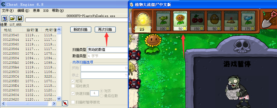 2.切回游戏,然后等待0.5秒左右,马上暂停,回到CE搜索变动的数值,循环往复,直到向日葵完全冷却完毕,最后搜索一次变动的数据。