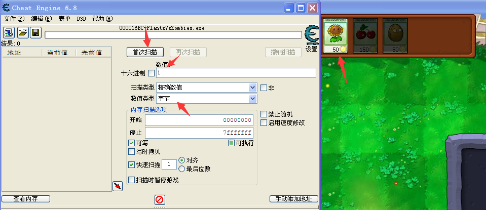 1.打开CE并开始一关新的游戏,然后直接将搜索类型修改为字节型,我们假设拿起植物是0,放下植物是1,这里默认向日葵是冷却完成了的,所以我们就直接搜索1