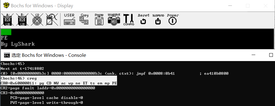 想要进入保护模式还差最后一步,通过控制CR系列寄存器切换CPU模式,CR寄存器是CPU的控制窗口,即可用来查询CPU的内部状态,也可用于直接控制CPU的运行机制,切入保护模式最需要关注的是CR0寄存器中的PE位。