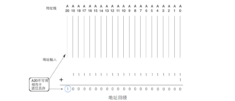 地址回绕线是为了兼容8086实模式而增加的,在实模式下地址线只有20条,寻址空间只能是1MB(0x00000 - 0xFFFFF)如果超出1MB的寻址范围,那么在默认开启地址回绕的CPU上,会自动将超出1MB的部分回绕到0地址处,继续从0地址处开始映射,地址回绕如下图。
