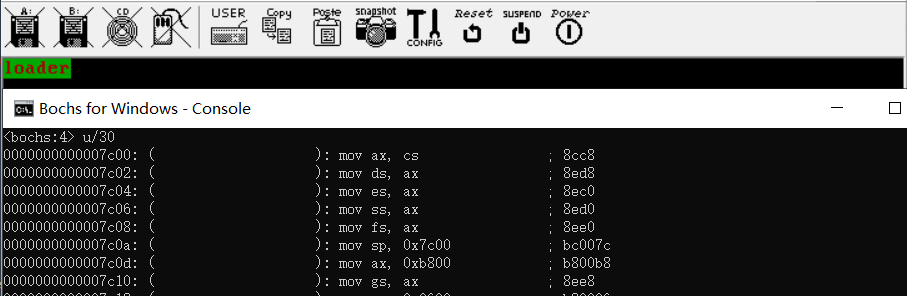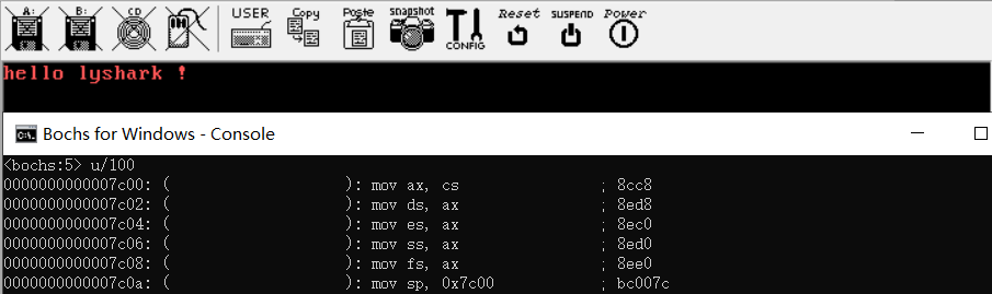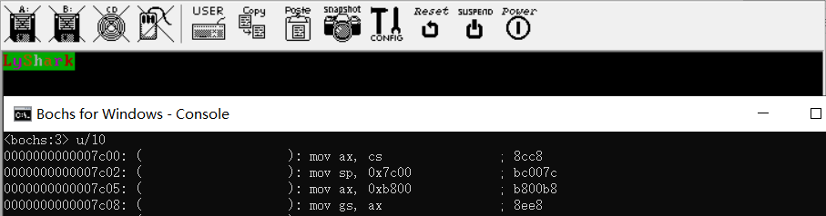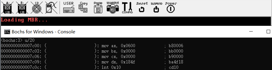 启动时可以直接调用bochsdbg -q -f mbr.src命令,使用调试模式运行,并通过语句vb sp:0x7c00在开头下断点,使用c命令可运行到MBR代码处,单步n执行,即可输出一段话,标志着MBR已经成功被加载.