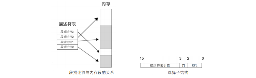 选择子的作用主要是确定段描述符,确定描述符的目的,一是为了特权级、界限等安全考虑,最主要的还是要确定段的基地址。