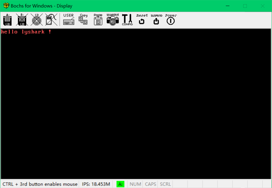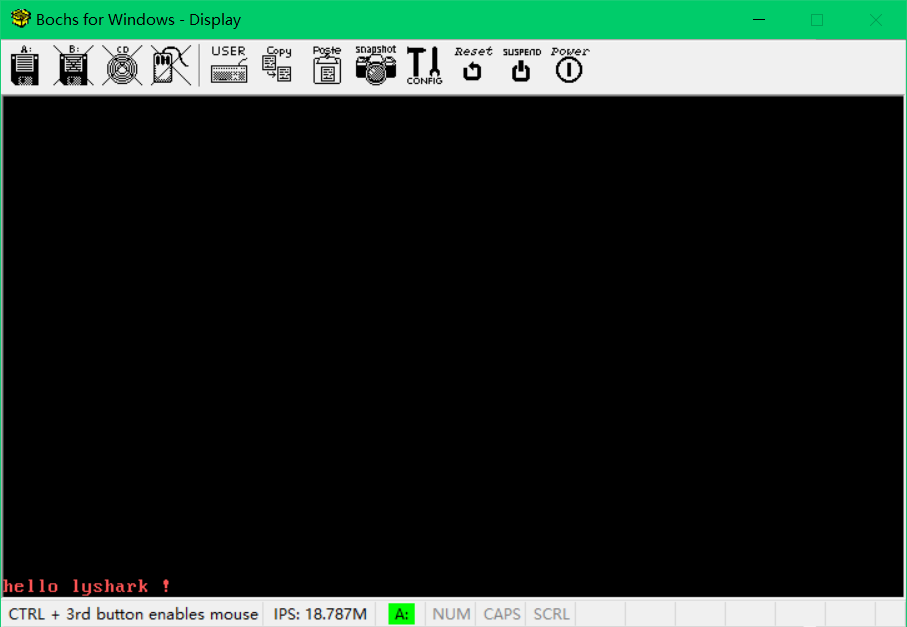 在Bochs目录下新建并编辑bosh.src保存,然后执行bochs.exe -f bosh.src模拟执行MBR代码.