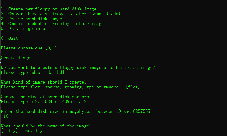 进入Bochs目录下执行bximage.exe生成一个映像文件,默认是a.img,你可以改名为其他的,这里我定义为linux.img
