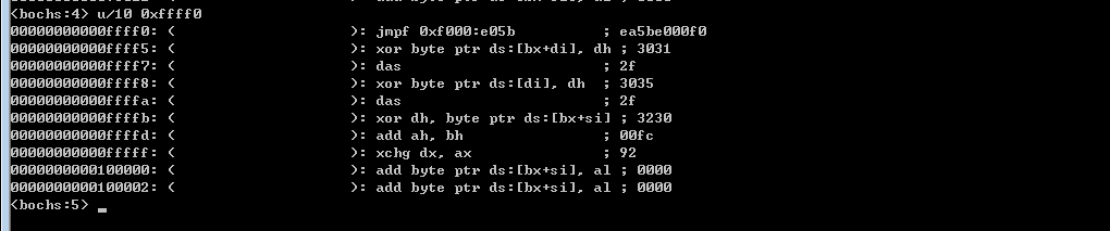 CPU加电后,会跳转到 0xffff0 处,我们可以反汇编这段内存地址,向下反汇编10条。