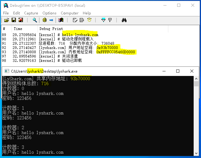 手动编译这两个程序,将驱动签名后以管理员身份运行lyshark.exe客户端,此时屏幕中即可看到滚动输出效果,如此一来就实现了循环传递参数的目的。