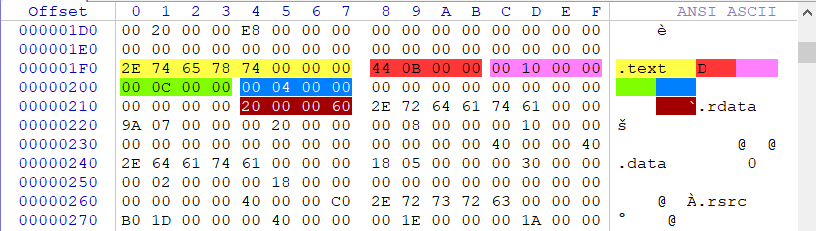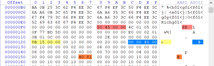 首先先来演示一下内存VA地址与FOA地址互相转换的方式,通过使用WinHEX打开一个二进制文件,打开后我们只需要关注如下蓝色注释为映像建议装入基址,黄色注释为映像装入后的RVA偏移。