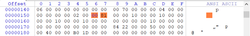 为了方便我们调试,我们需要手动干掉它,其对应到PE文件中的结构为 IMAGE_NT_HEADERS -> IMAGE_OPTIONAL_HEADER -> DllCharacteristics 相对于PE头的偏移为90字节,只需要修改这个标志即可,修改方式 x64:6081 改 2081 相对于 x86:4081 改 0081 以X86程序为例,修改后如下图所示。