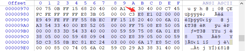 经过公式的计算,我们找到了虚拟地址0040158B对应到文件中的位置是98B,通过WinHEX定位过去,即可看到OEP处的机器码指令了。