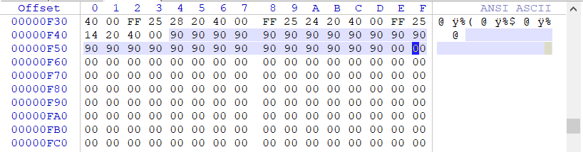 再次使用WinHEX查看文件偏移为0xF43的位置,会发现已经全部替换成了90指令,说明计算正确。