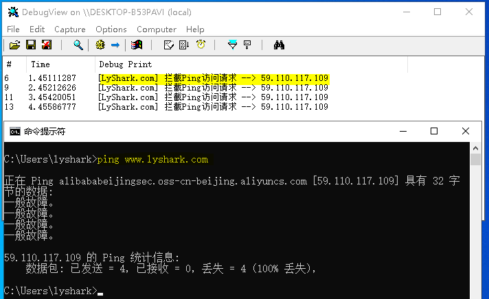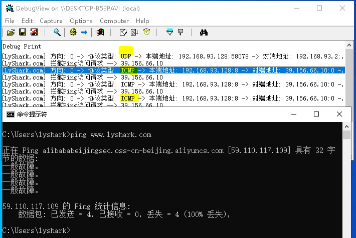 DbgPrint("[LyShark.com] 拦截Ping访问请求 --> %s \n", szRemoteAddress);