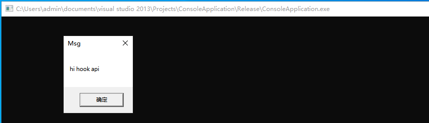 MsgHook.Hook((char *)"user32.dll", (char *)"MessageBoxA", (PROC)MyMessageBoxA);