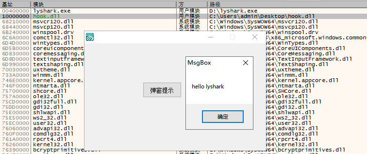 编译上方代码片段,并生成一个hook.dll文件,通过使用注入器将该模块注入到指定进程中,此时再次点击弹窗提示会发现功能已经被替换了,打开x64dbg也可看到模块已经被注入,如下图所示;