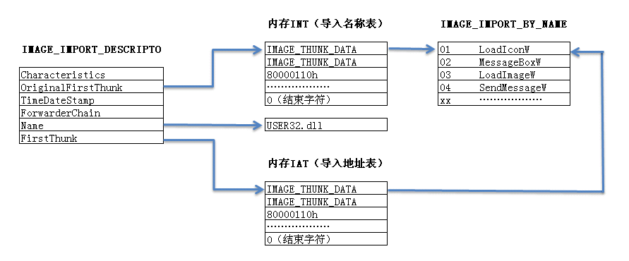 如上图IMAGE_IMPORT_DESCRIPTO导入表结构中的FirstThunk和OriginalFirstThunk分别指向两个相同的IMAGE_THUNK_DATA结构,其中内存INT(Improt Name Table)表中存储的就是导入函数的名称,而IAT(Improt Address Table)表中存放的是导入函数的地址,他们都共同指向IMAGE_IMPORT_BY_NAME结构,而之所以使用两份IMAGE_THUNK_DATA结构,是为了最后还可以留下一份备份数据用来反过来查询地址所对应的导入函数名,看了这张图再结合上面的实验相信你已经理解了;