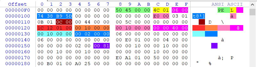 上图中在PE字符串开头位置向后偏移1字节,就能看到黄色的014C此处代表的是机器类别的十六进制表示形式,在向后偏移1个字节是紫色的0006代表的是程序中的区段数,继续向后偏移1字节会看到蓝色的5DB93874此处是一个时间戳,代表的是自1970年1月1日至当前时间的总秒数,继续向后可看到灰色的000C此处代表的是链接器的具体版本。