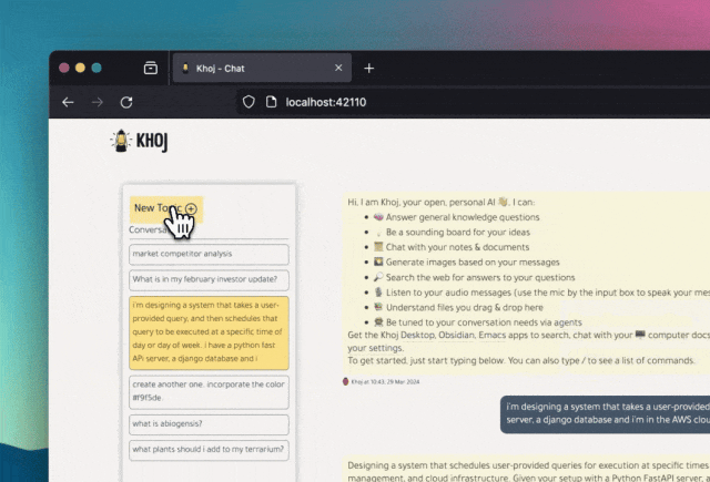 • 云或自托管 :使用云随时随地使用 Khoj,或自托管以保护隐私。