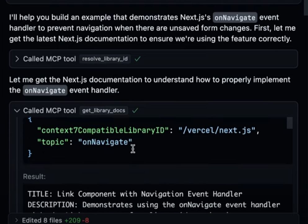 当你向 AI 助手提问,涉及到某个库时,助手会先调用 Context7 的 resolve_library_ID 工具,根据你的模糊描述 (比如 "nextjs middleware") 找到准确的库 ID (比如 "nextjs-15")。