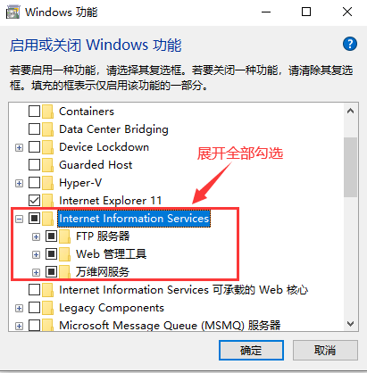 2,勾选【Internet Information Services】选项,下面展开的都勾选上,完成后点击【确定】按钮。