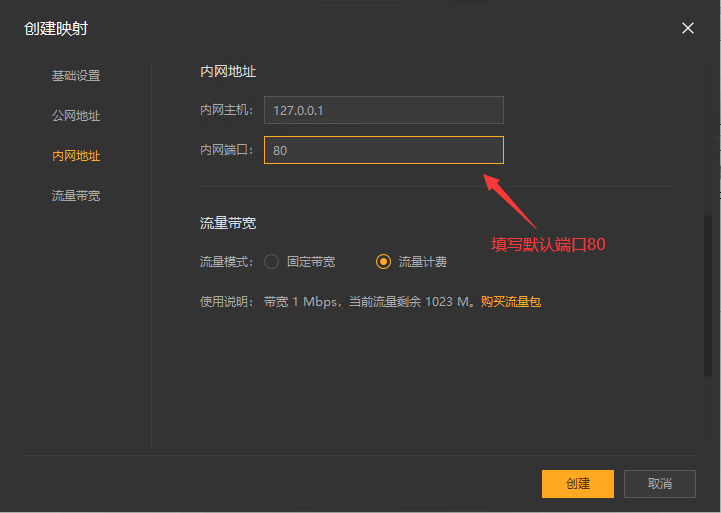 4,界面下滑到内网地址位置,在内网端口一栏填写上默认的端口80,然后点击【创建】按钮。