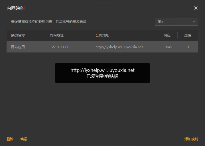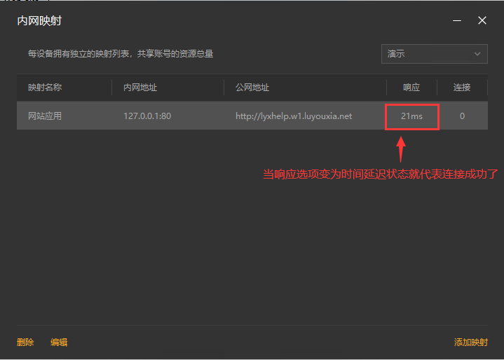 5,创建完成后,会出现一个外网地址,当响应的...变成时间延迟状态,如下图,就代表连接成功了。