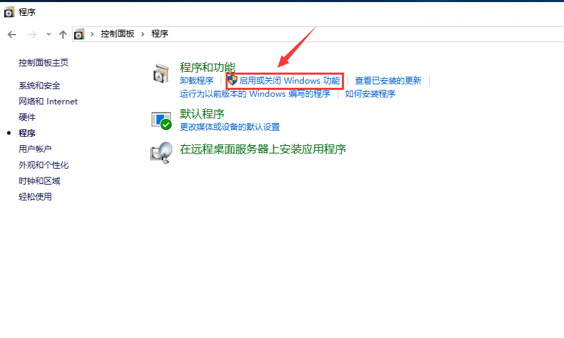 1,找到控制面板,点击【启动或关闭 Windows 功能】,如下图。