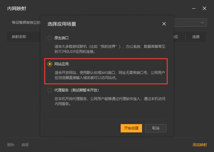 3,在应用场景界面,选择【网站应用】选项,然后点击【开始创建】按钮。