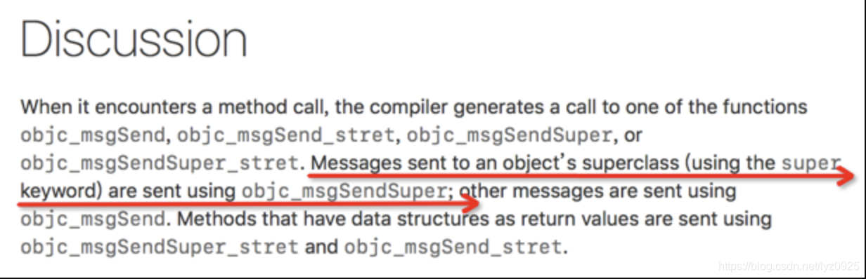 从官方解释,可以明确了解到当我们使用“super”关键字发送消息的时候,编译器会转化为调用objc_msgSendSuper这个方法来发送消息。
