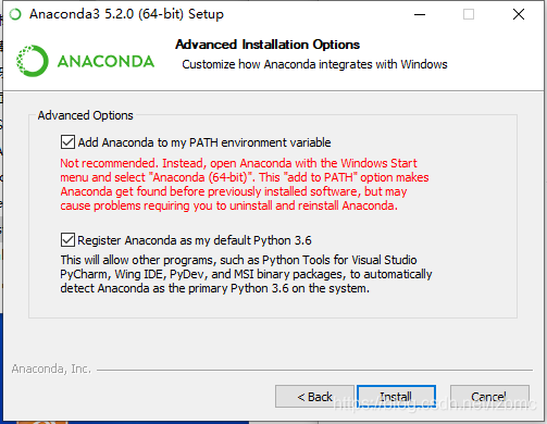 两个都勾选,尤其是第一个,将anaconda加入到系统的环境变量中