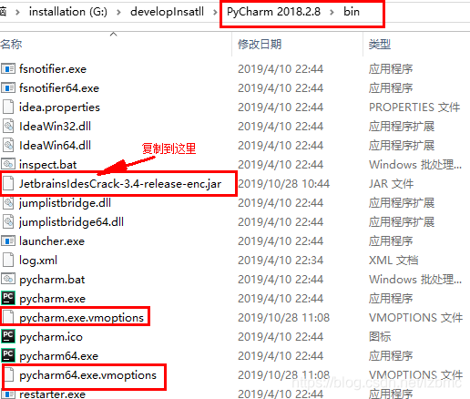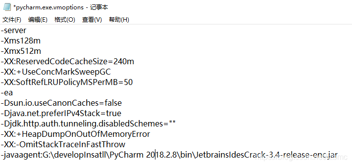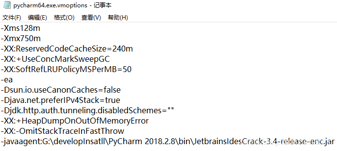 最后一行加入 -javaagent:G:\developInsatll\PyCharm 2018.2.8\bin\JetbrainsIdesCrack-3.4-release-enc.jar