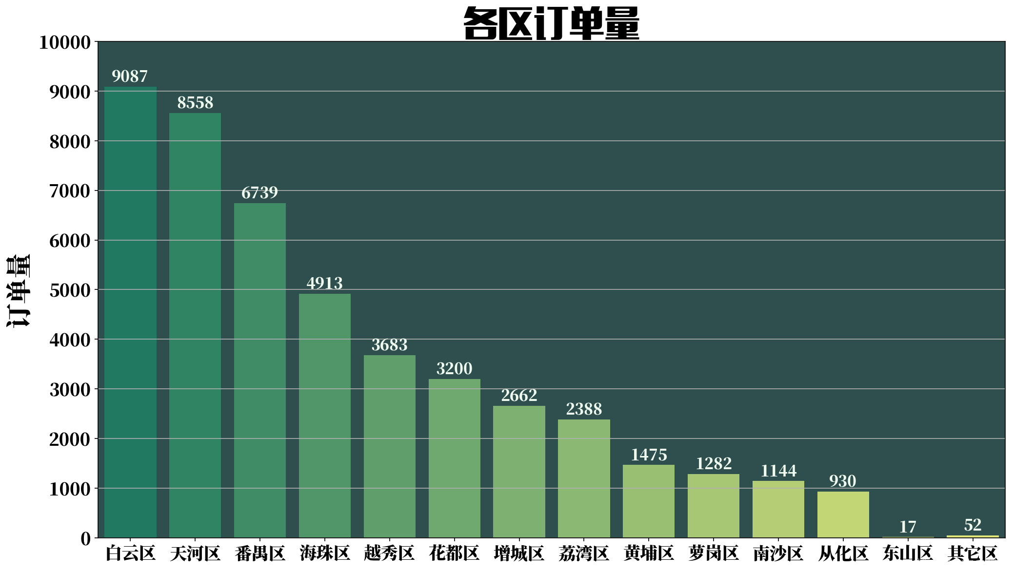 plt.text(x, y + 100 , 各区订单数[x], fontsize = 15, color = 'honeydew', fontdict={'horizontalalignment': 'center'})