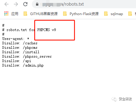 答案是的,有些CMS系统会将一些敏感的目录,比如后台管理界面等不允许搜索引擎抓取,也会将一些独特的特征码放入该文件中,以此我们可以根据特征文本关键词进行判定。下图目标网站使用的是PHPCMS v9搭建的系统,通过访问robots文件对比特征码就很容易的识别出使用的CMS类型。