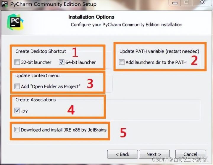 数字5:不要选,我第一次安装的时候就是勾选了,差点放弃。pycharn是国外的软件,网站就是国外,下载速度很慢。有人选上等一两个小时,我等半小时,直接强制关掉。没勾选安装很快完成。把数字1和数字4勾选就好,数字2和数字3看你自己需求。(数字5如果有需求,自己可以单独去官网下载安装JRE)